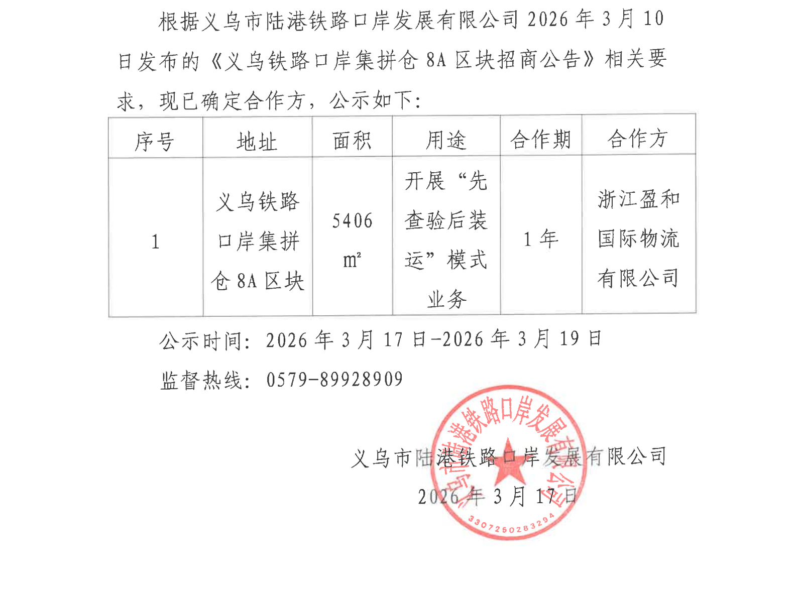 义乌铁路口岸集拼仓8A区块招商结果公示
